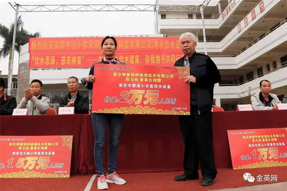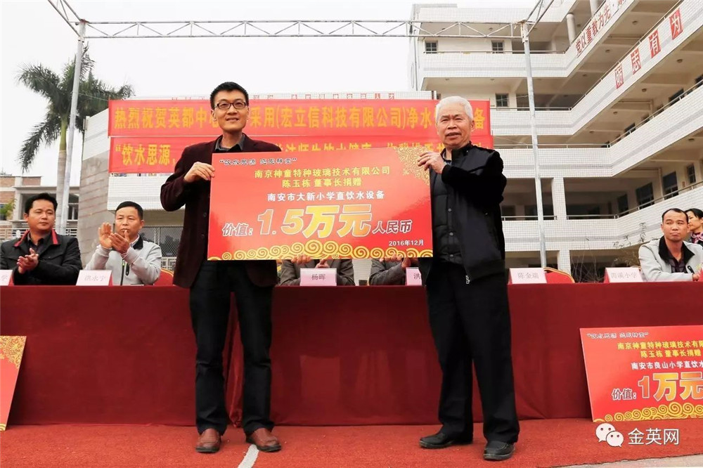 陳玉棟先生的老父親也到現場參加了捐贈交接儀式,陳老先生說:感謝英都各級領導們給南京神童特種玻璃技術有限公司為家鄉教育事業服務的機會,神童公司愿意跟家鄉人民、跟家鄉的學子們一起分享辛勤勞作收獲的經濟成果!