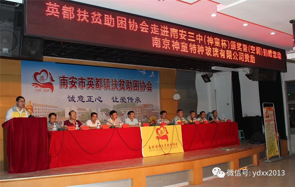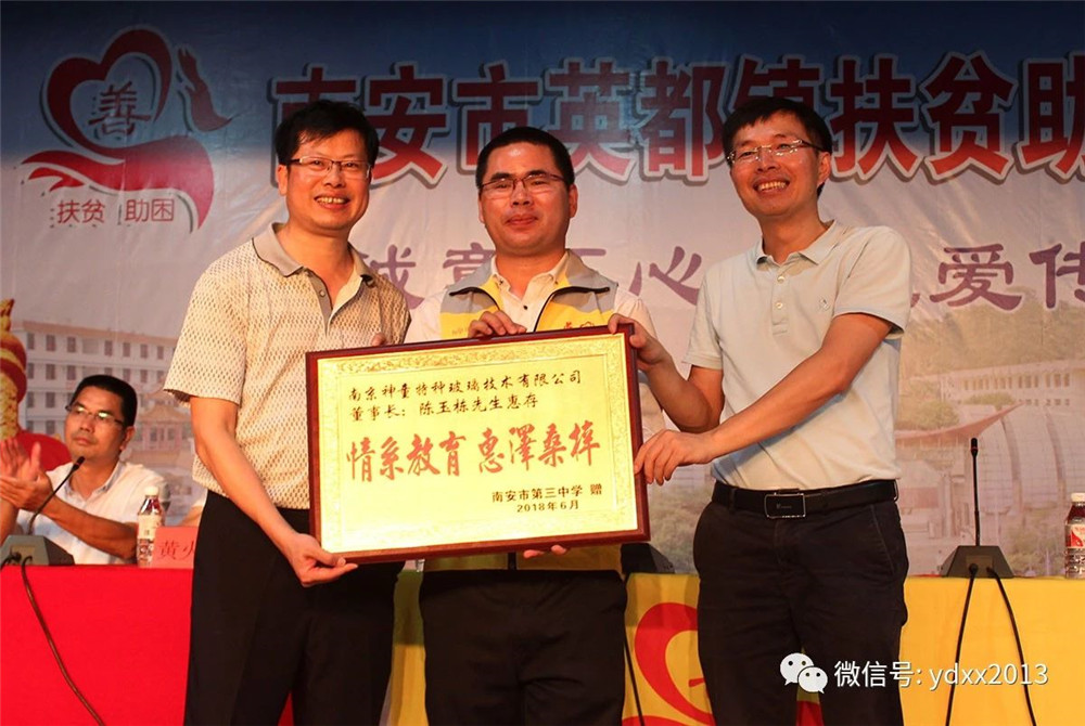 英都鎮(zhèn)扶貧助困協(xié)會會長洪梅生首先致詞,他說,今天的頒獎儀式是協(xié)會常務(wù)副會長、南京神童特種玻璃技術(shù)有限公司董事長陳玉棟慷慨捐資獨家贊助南安三中初中部和英都中學(xué)五年計劃&ldquo;神童獎杯和獎學(xué)金&rdquo;。他向首批獲得神童獎杯和獎學(xué)金的南安三中15位同學(xué)表示祝賀。
